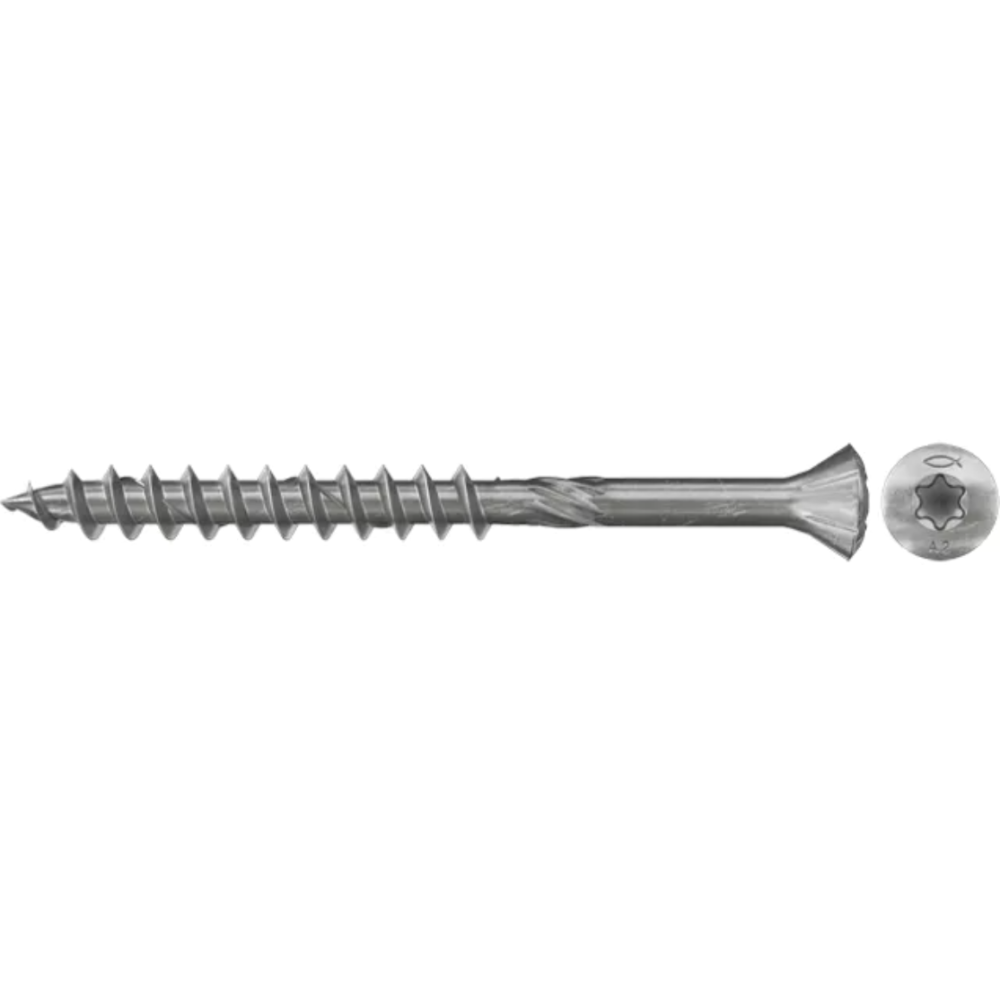 Vis de façade en bois Fischer FFSII-RT6 présentant une petite tête fraisée et un réceptacle intérieur en étoile - Convient pour la fixation de clôtures en bois et de clôtures d'intimité en bois de hêtre, de douglas, de chêne, d'épicéa, de pin ou de bois de sapin - Fabriquée en acier inoxydable de type A2 - Résiste aux intempéries et à l'acide tannique - Fait 40 mm de long et 4.5 mm de diamètre - Conçue avec un réceptacle intérieur en étoile permettant une adhésion parfait à l'embout de la visseuse.