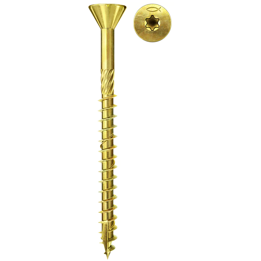 Vis fine PowerFast FDF-ST YZP de couleur dorée idéale pour la fixation des plaques MDF - Fabriquée avec une empreinte étoilée TX qui assure une transmission maximale avec une grande stabilité de l'embout - Embarque une tête fraisée 75° incluse dans le but de faciliter le vissage affleurant dans les panneaux de fibres à densité moyenne - Dispose d'un filetage partiel adapté pour empiler les éléments les uns sur les autres solidement.