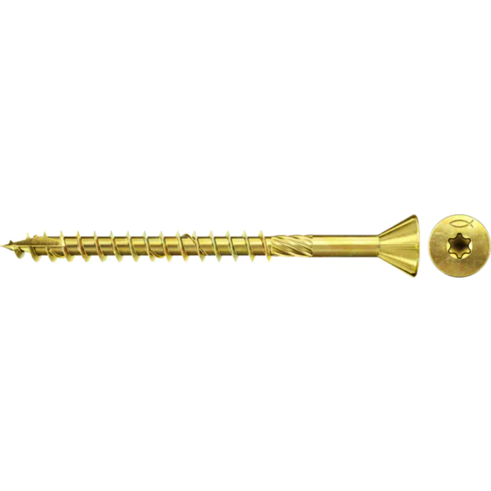 Vis fine PowerFast FDF-ST YZP de couleur dorée idéale pour la fixation des plaques MDF - Fabriquée avec une empreinte étoilée TX qui assure une transmission maximale avec une grande stabilité de l'embout - Embarque une tête fraisée 75° incluse dans le but de faciliter le vissage affleurant dans les panneaux de fibres à densité moyenne - Dispose d'un filetage partiel adapté pour empiler les éléments les uns sur les autres solidement.