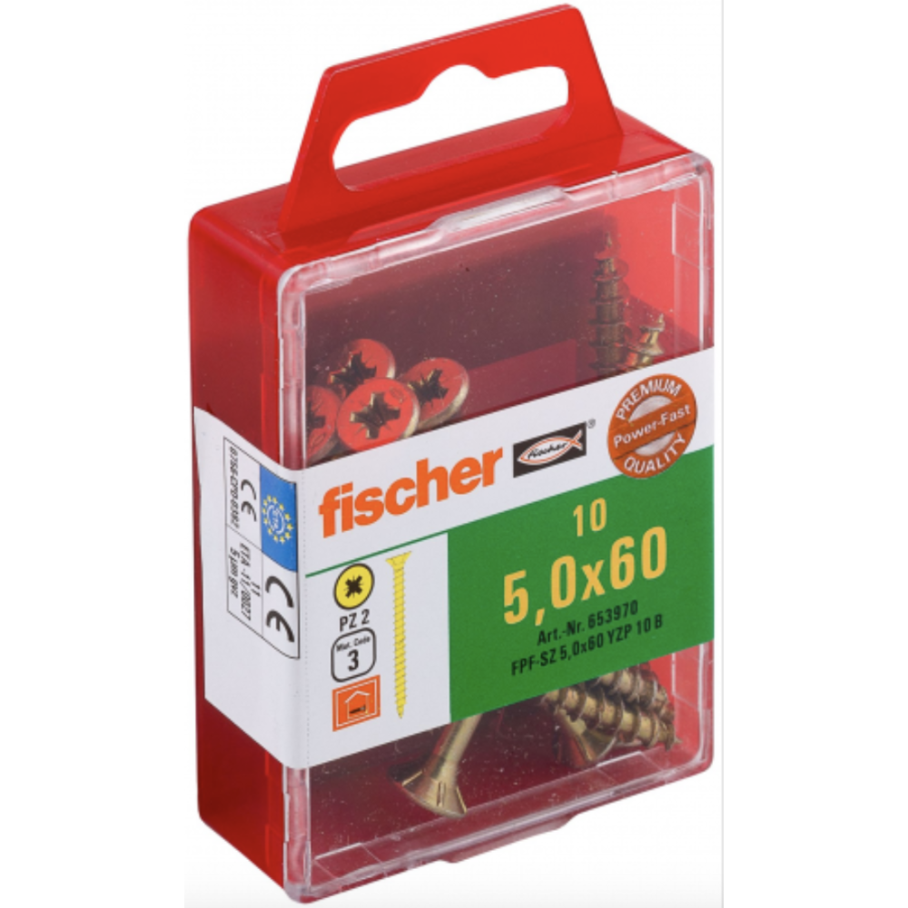Boîte de 10 vis à bois Fischer 653970 - Homologation ETA/VDS : Oui - Usage : DIY - Empreinte : PZ2 - Dimensions : Ø 5,0 mm, longueur 60 mm, filetage 36 mm, tête Ø 10,0 mm - Type : Vis à aggloméré - Emballage : Boîte en plastique - Caractéristiques : Filetage PowerFast pour une morsure rapide ; Tête fraisée pour montage affleurant ; Friction réduite grâce au revêtement haute performance ; Certifiée ETA pour une sécurité élevée ; Convient aux bois tendres et durs ; Filetage partiel pour une fixation solide des éléments en bois.