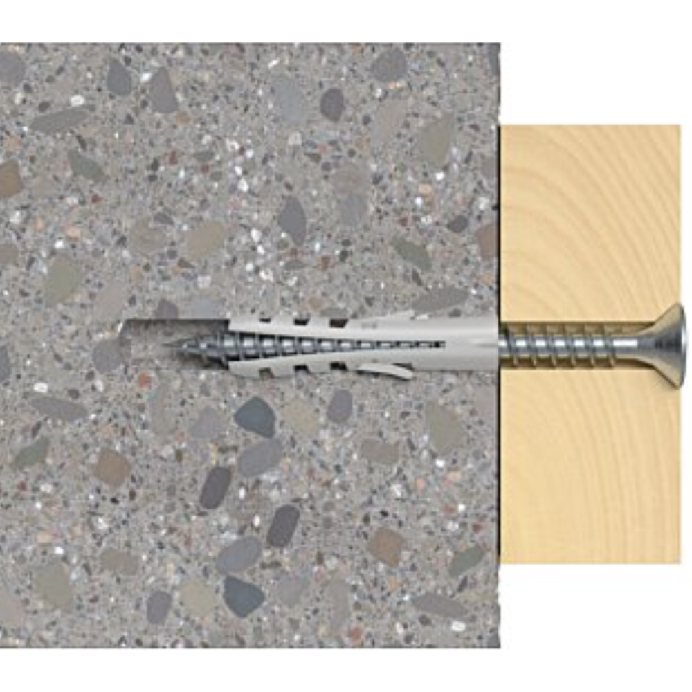 Cheville à expansion Fischer S 16 (Ref. 50116) - Fixation facile : En nylon, installation rapide avec double écartement - Montage : Frontal ou traversant, enfichage simple - Sécurité : Protection contre la torsion pour éviter la rotation dans le trou ; Enfoncement profond sous le plâtre pour charge maximale - Optimisation de l’ancrage : Expansion contrôlée pour réduire les distances aux bords ; Ailettes anti-rotation pour une fixation stable - Caractéristiques techniques : Diamètre du trou : 16 mm ; Longueur : 80 mm ; Profondeur min. du perçage : 100 mm ; Vis compatibles : 12 mm (1/2") - Matériaux compatibles : Béton, brique pleine, pierre naturelle dense, brique silico-calcaire Conditionnement : 10 pièces - EAN : 4006209501160.