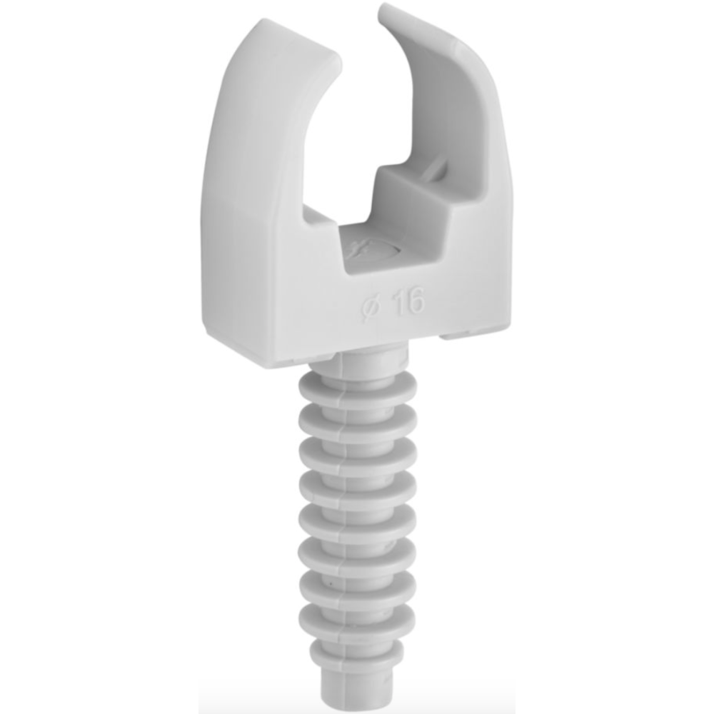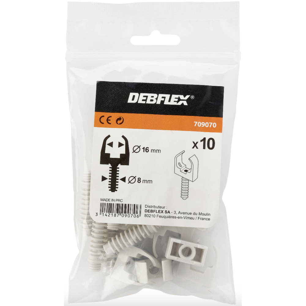 Sachet de 10 clips avec chevilles Debflex (réf. 709070) en PVC pour tubes IRL - Diamètre : Ø 16 mm - Fixation facile à visser sur le support - Coloris : Gris - Conditionnement : Sachet de 10 pièces - EAN : 3142187090706.
