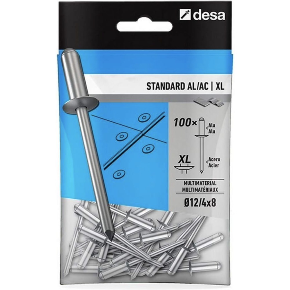 Rivet standard aluminium/acier à tête large – Réf. QS702943 - 45 unités - Utilisation : Assemblage de matériaux métalliques avec grande surface d’appui - Corps : Aluminium Al Mg 3,5 % - Tige : Acier zingué - Tête large : Ø 14 mm - Dimensions : Ø 4,8 mm x 16 mm - EAN : 8429586982067.