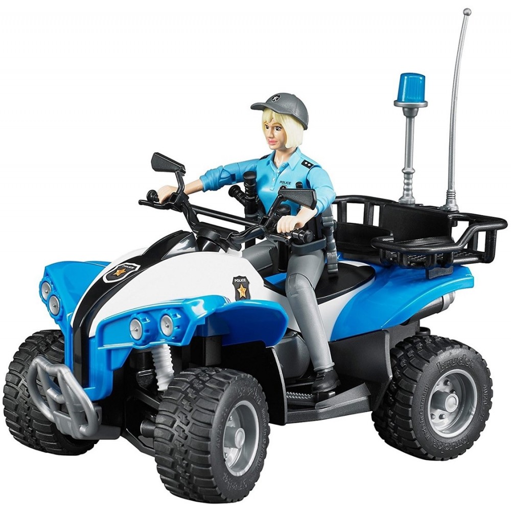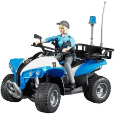 Quad police avec policière - Roues avant directionnelles. Le porte-bagages est amovible - Figurine articulée de 10,6 cm avec ses accessoires dont un pistolet et des menottes - Le gyrophare est factice - En plastique - Pour jouer à l'intérieur et à l'extérieur - A partir de 4 ans.
