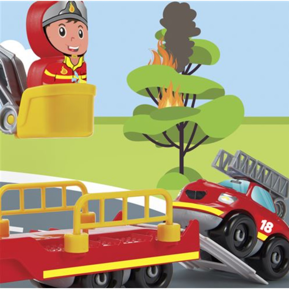 L’intervention pompier est idéal pour mettre en scène des histoires à l’aide d’une nacelle pivotante, d’un camion pompier, d’un personnage et de barrières - 34 pièces.