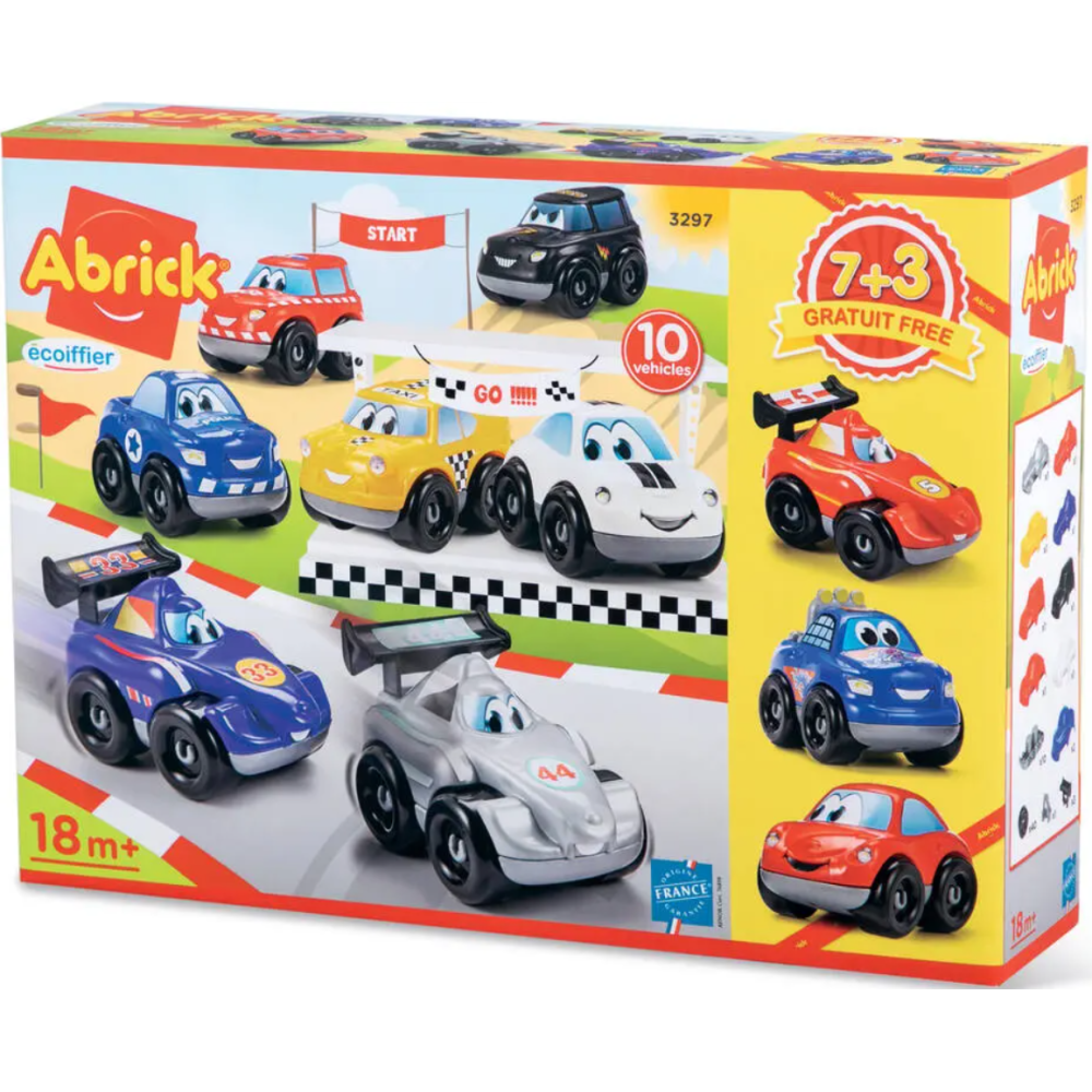 Jeu de construction Ecoiffier comportant 10 véhicules aux châssis interchangeables incluant des formules 1, 1 véhicule de pompier, 1 véhicule de police et 1 taxi - Fourni avec 3 véhicules gratuits - Recommandé pour les enfants dès l’âge de 18 mois - Proposé dans un petit carton faisant 520 grammes - Approprié pour faire découvrir à un petit garçon la puissance et la vitesse des différents types de véhicules.
