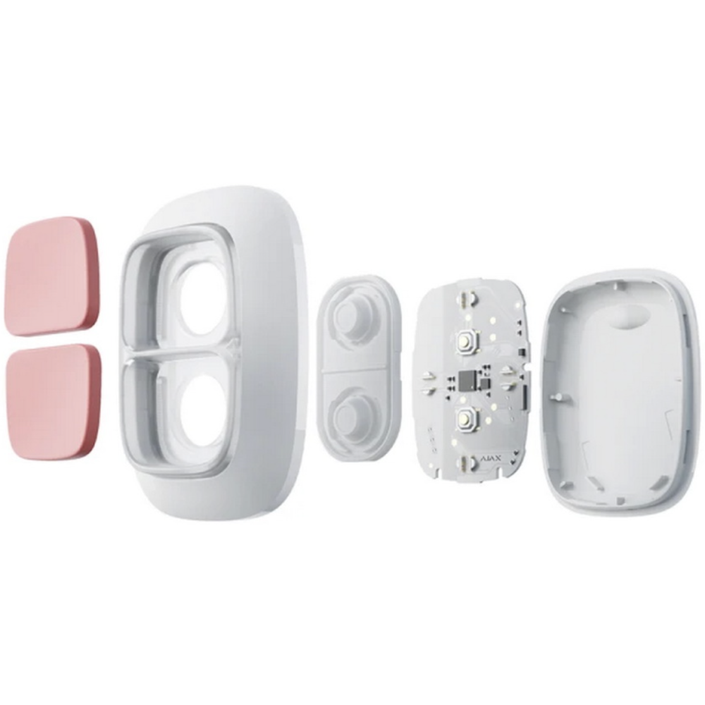 Bouton panique sans fil avec protection contre l'activation accidentelle AJAX 23003.79.WH1 Double button - Connecté au système de sécurité AJAX - Configurable via les applications AJAX sur iOS, Android, macOS et Windows - Notifications push, SMS et appels téléphoniques en cas d'alarme ou d'événement (si activés) - Raccordement : Radio - Environnement : Intérieur - Matériaux : Polycarbonate - Couleur : Blanc - Nombre de boutons : 2 - Gamme : Ajax Baseline - Dimensions : 47 × 35 × 16 mm.